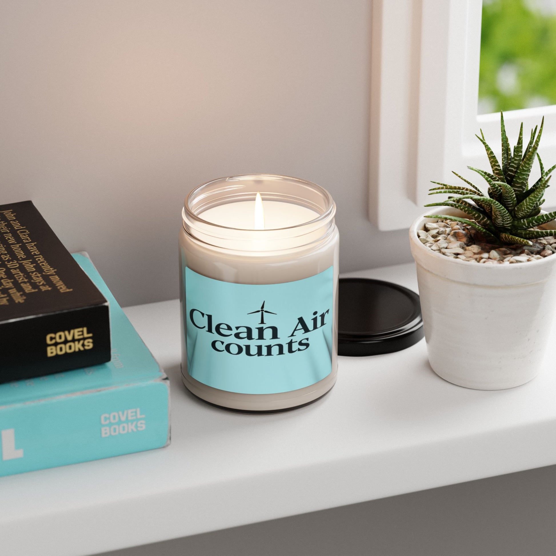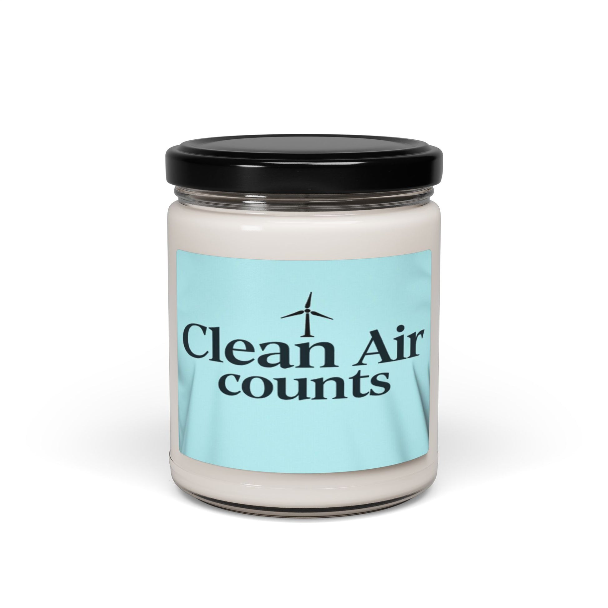The image displays a minimalist graphic design on a light blue or mint green background featuring the text "Clean Air counts" in large, dark navy blue typography. Above the text sits a simple, stylized black wind turbine icon, symbolizing renewable energy and environmental sustainability. The design appears to be part of a t-shirt or fabric print, with subtle fabric texture and folds visible. The typography is clean and modern, using a serif font that gives a sense of authority and importance to the message. The overall color palette and design suggest a message promoting clean energy and environmental awareness.