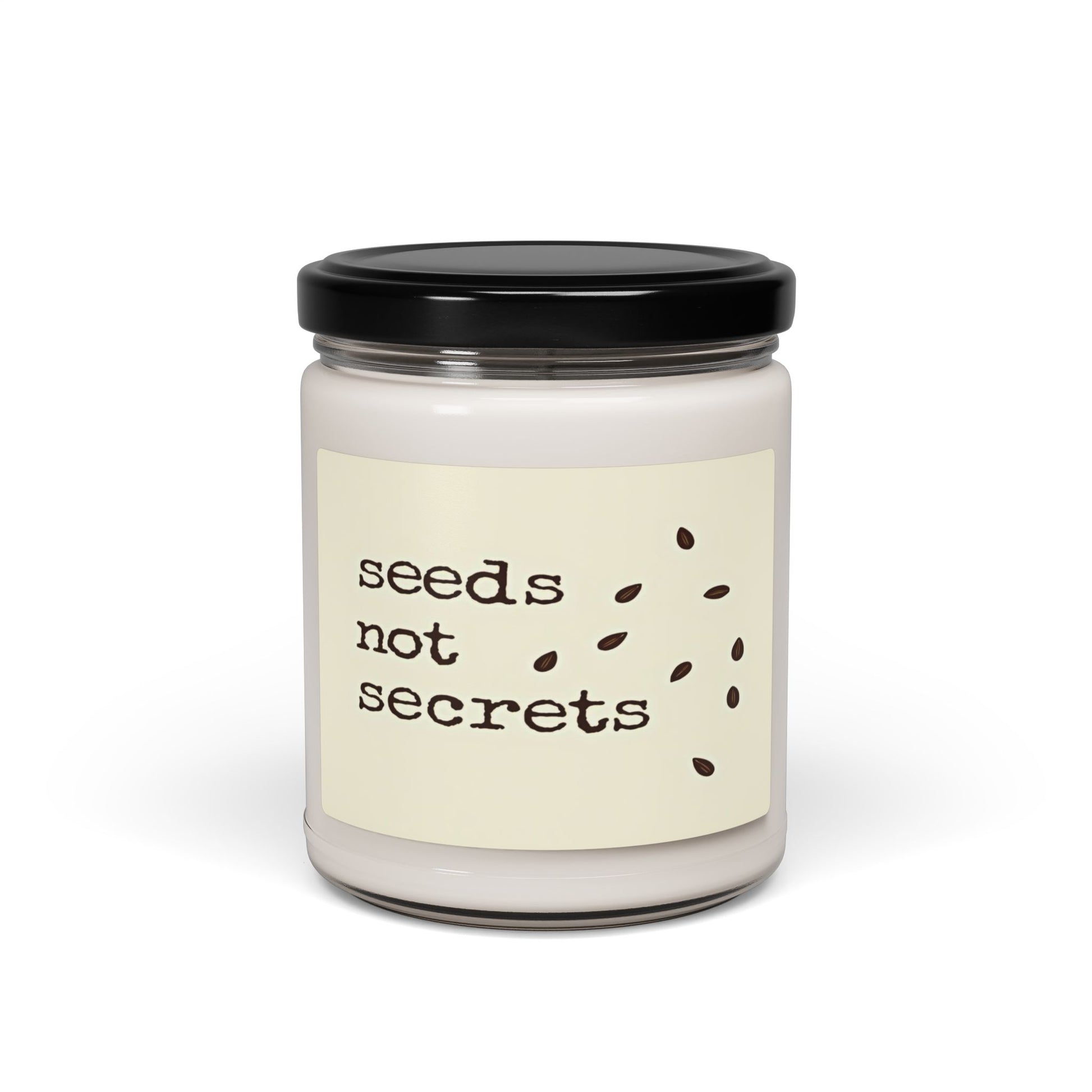 This minimalist graphic features the text "seeds not secrets" in a typewriter-style font, set against a light background. Several brown seed-like objects are scattered to the right of the text, appearing to be elongated and slightly curved. The image uses a monochromatic color palette, with the text and seeds in a deep brown color. The design has a clean, simple aesthetic that draws attention to the playful and intriguing phrase. The typography and seed illustrations create a balanced and visually appealing composition.