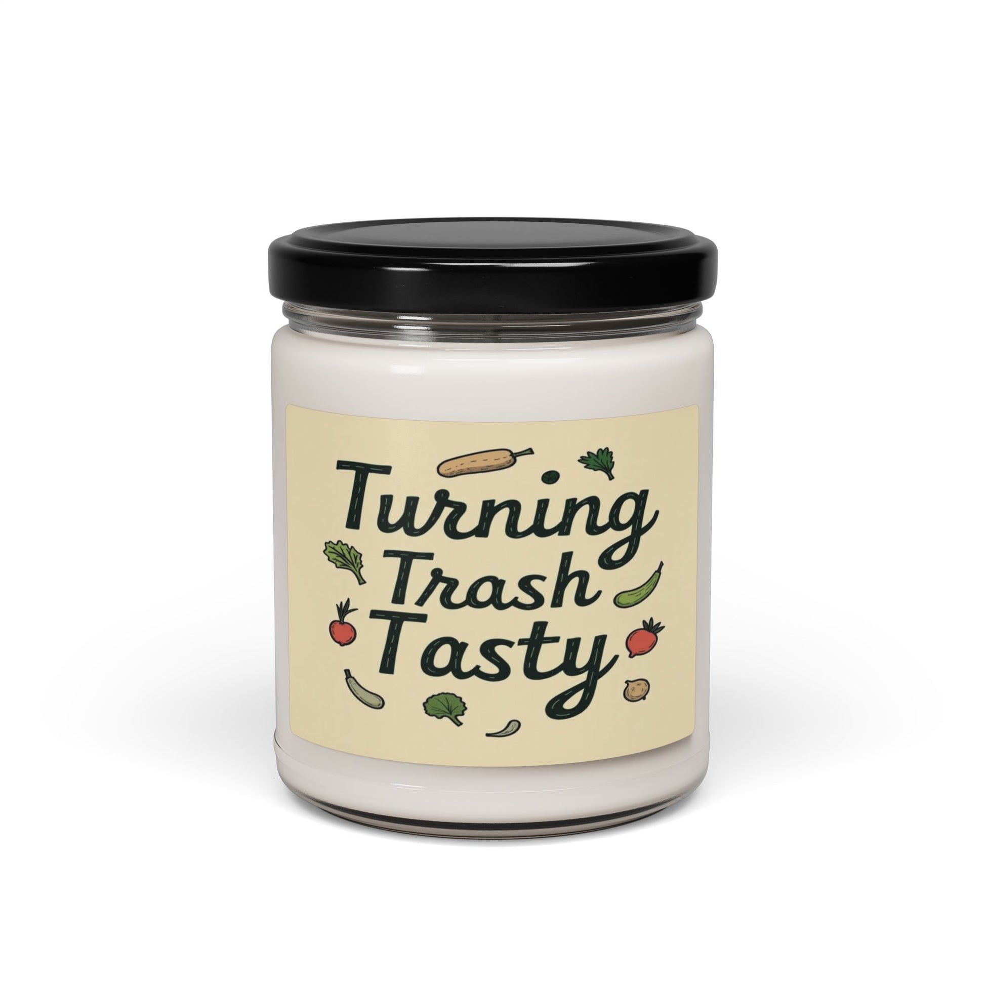 This image features the playful phrase "Turning Trash Tasty" surrounded by hand-drawn illustrations of various vegetables and produce items. The graphic design has a vintage, hand-sketched aesthetic with a muted beige background and vegetables drawn in shades of green, red, and gray. Scattered around the text are depictions of a parsnip or daikon, leafy greens, a red beet, zucchini or cucumber, an onion, and other produce. The typography is bold and slightly irregular, giving the design a casual, organic feel that complements the vegetable illustrations. The overall composition suggests a theme of transforming overlooked or discarded produce into delicious, sustainable cuisine.