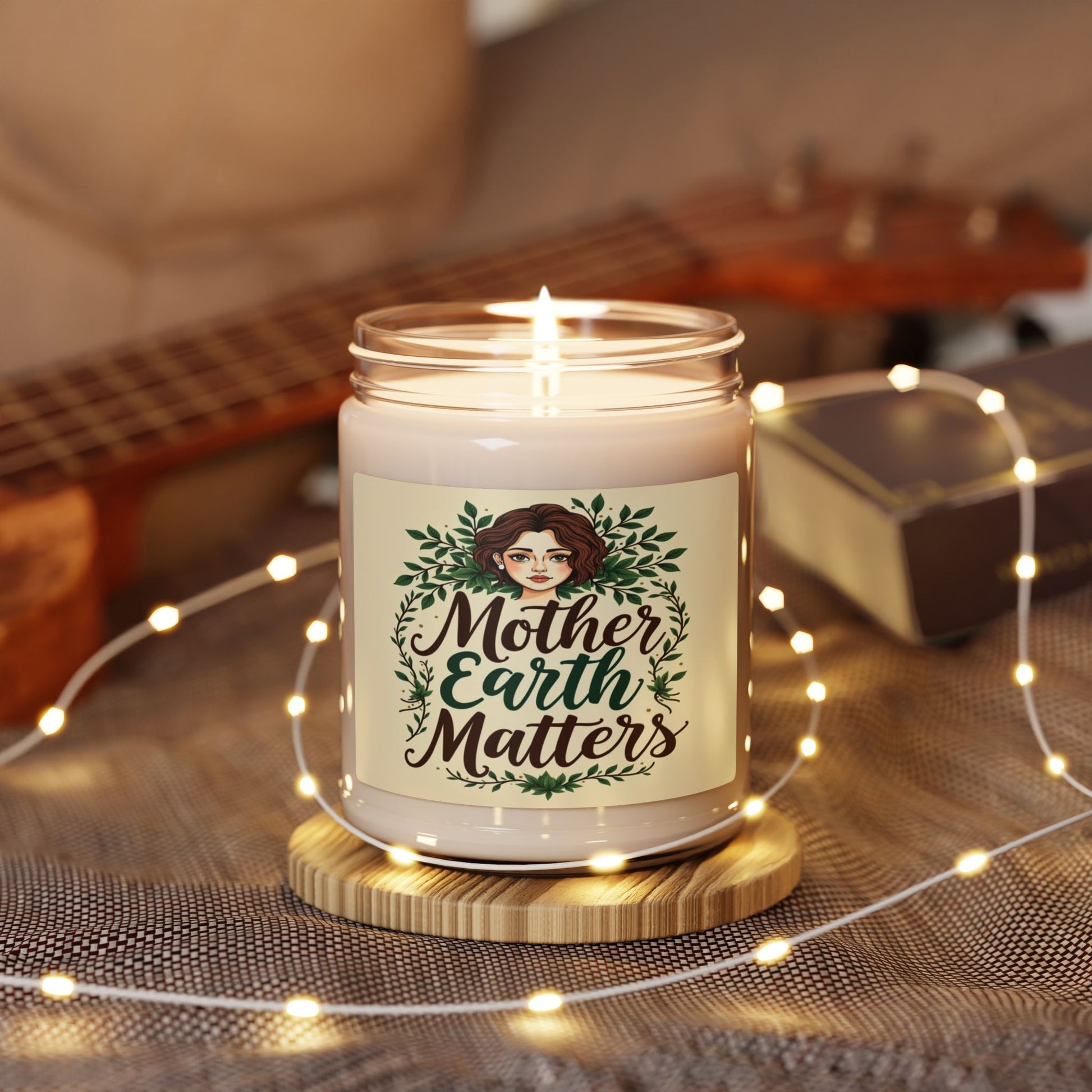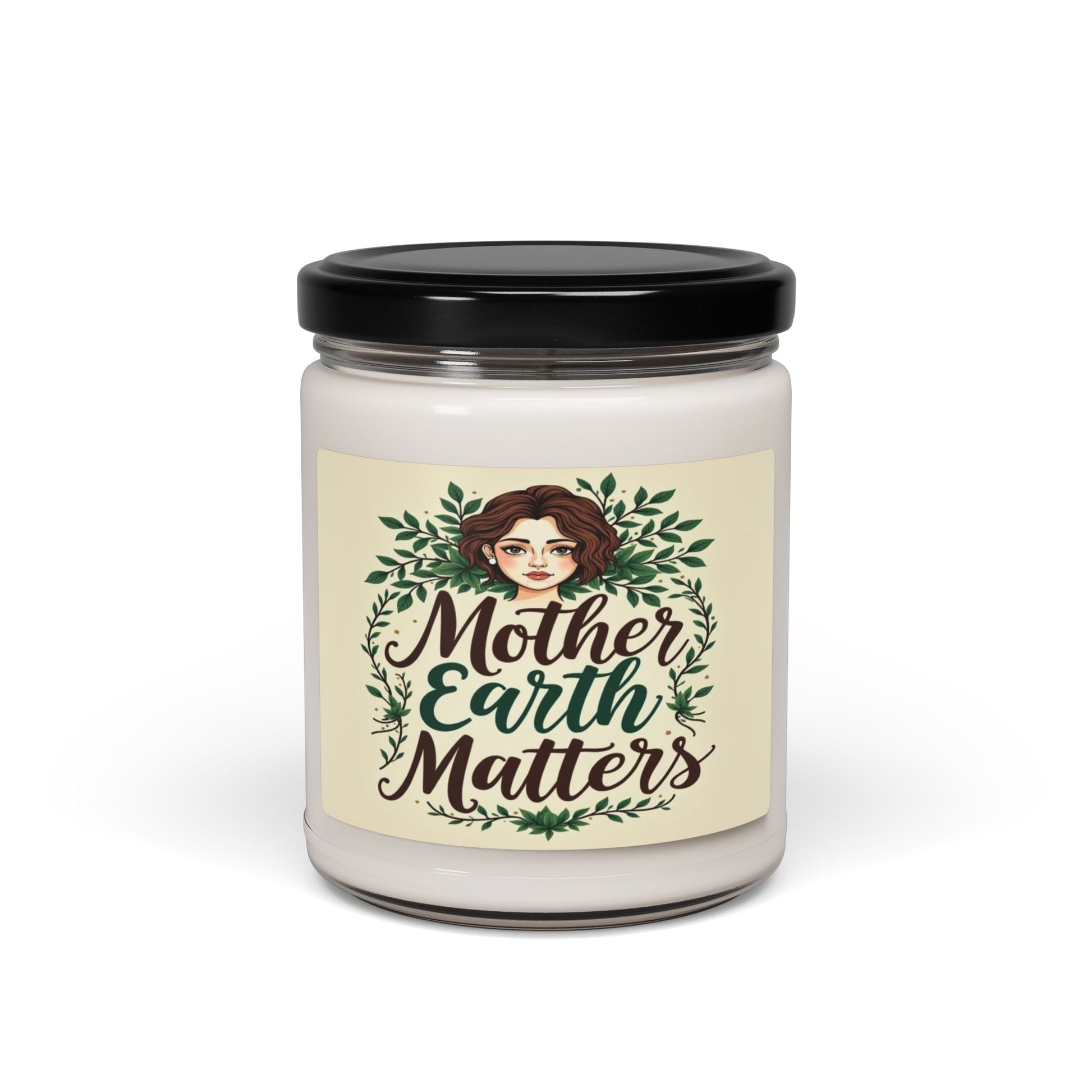 This artistic illustration features a stylized portrait of a woman surrounded by lush green leaves, creating a nature-inspired graphic with the text "Mother Earth Matters". The image is rendered in a whimsical, illustrative style with a soft color palette of browns, greens, and cream. The woman has wavy shoulder-length hair and is positioned centrally, framed by a symmetrical wreath of botanical elements. The typography is handwritten and flowing, with "Mother" and "Matters" in a rich brown color, and "Earth" in a deep green. The overall design evokes themes of environmental awareness, feminine power, and ecological consciousness.